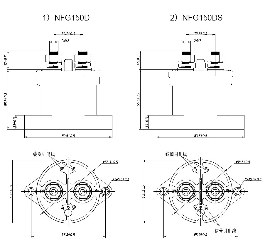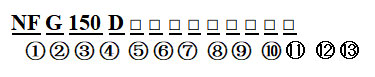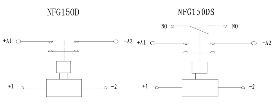 Exemple : NFG150DS indique que le courant nominal de la charge du produit est de 150 A (résistif), la forme du contact principal est un contact normalement ouvert (filetage extérieur) avec un contact auxiliaire normalement ouvert, la tension de la bobine est de 12 V CC et la méthode d'installation par le bas est utilisée.