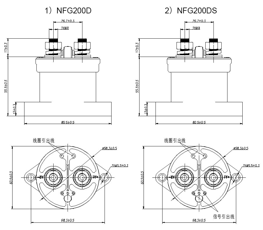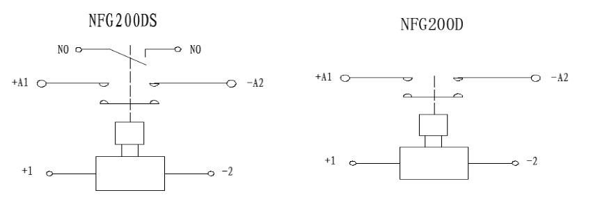 Exemple : NFG200DS indique que le courant nominal de la charge du produit est de 200 A (résistif), que la forme du contact principal est un contact normalement ouvert (filetage extérieur) avec un contact auxiliaire normalement ouvert, que la tension de la bobine est de 12 V CC et que la méthode d’installation par le bas est utilisée.