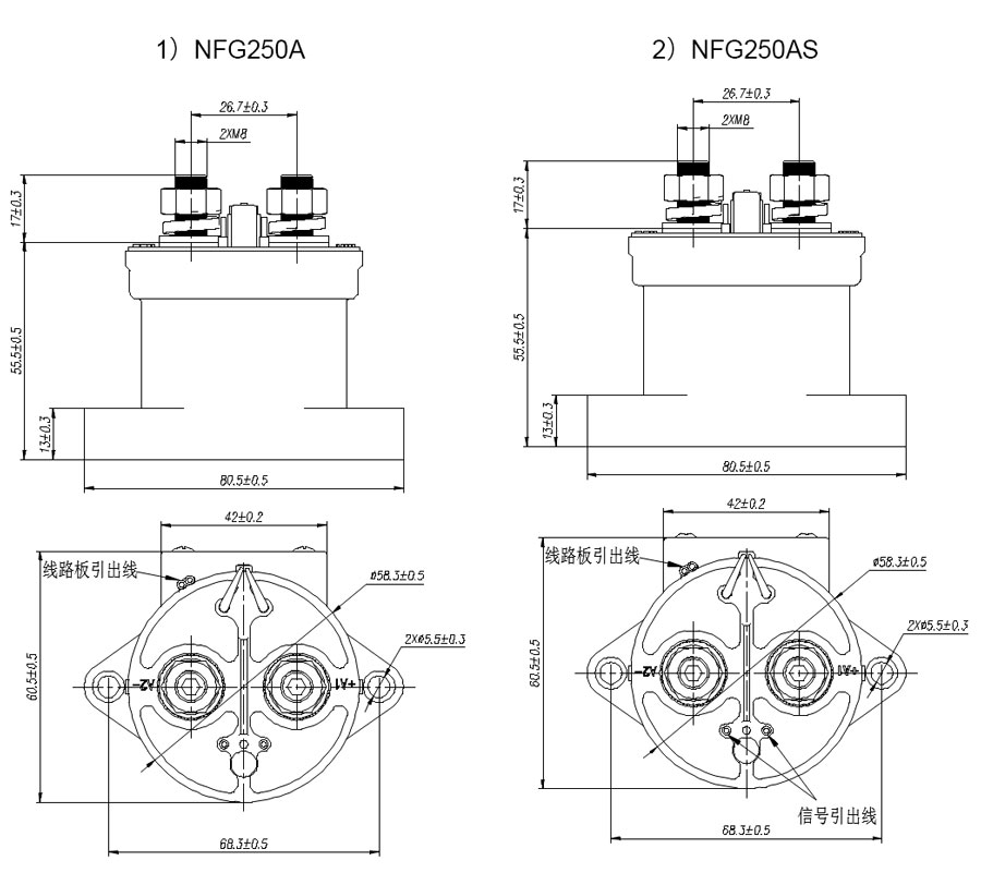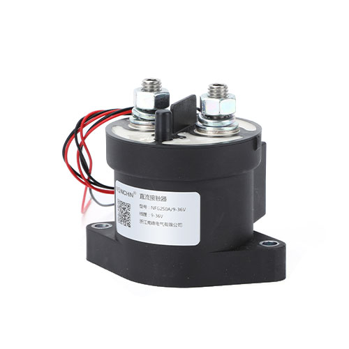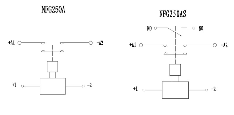 Exemple : NFG250AS indique que le courant nominal de la charge du produit est de 250 A (résistif), la forme du contact principal est un contact normalement ouvert (filetage extérieur) avec un contact auxiliaire normalement ouvert, la tension de la bobine est de (9-36) V (CC) et la méthode d'installation est par le bas.