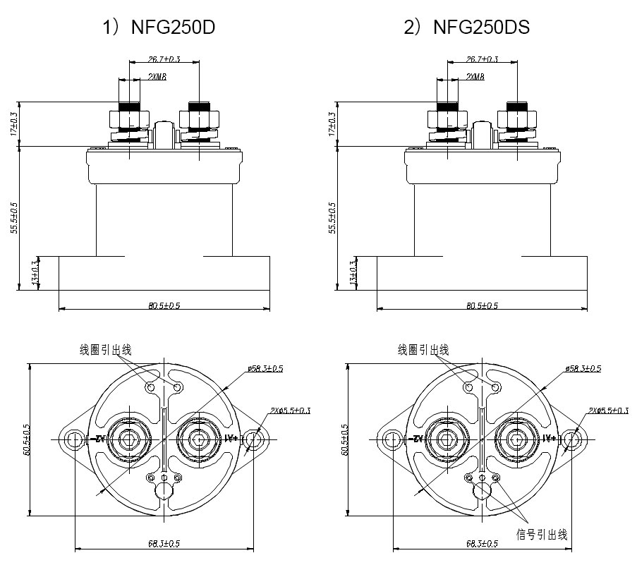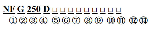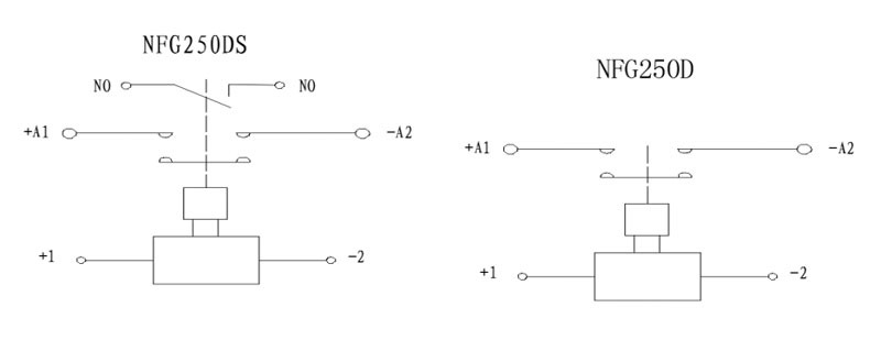 Exemple : NFG250DS indique que le courant nominal de la charge du produit est de 250 A (résistif), la forme du contact principal est un contact normalement ouvert (filetage extérieur) avec un contact auxiliaire normalement ouvert, la tension de la bobine est de 12 V CC et la méthode d'installation par le bas est utilisée.