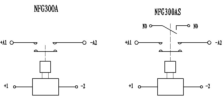 Exemple : NFG300AS indique que le courant nominal de la charge du produit est de 300 A (résistif), la forme du contact principal est un contact normalement ouvert (filetage extérieur) avec un contact auxiliaire normalement ouvert, la tension de la bobine est de (9-36) V (CC) et la méthode d'installation est par le bas.