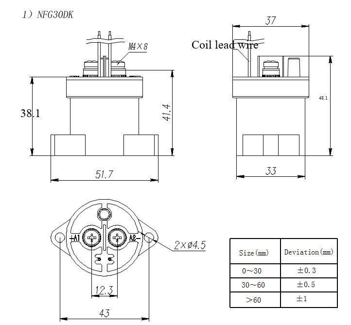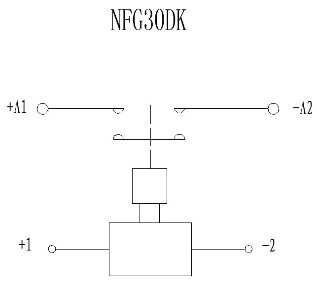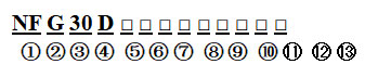 Exemple : NFG30DK/24V indique que le produit a un courant de charge nominal de 30 A (résistif), avec une forme de contact principal d'un contact normalement ouvert (filetage femelle), une tension de bobine de 24 V CC et une méthode de montage par le bas.