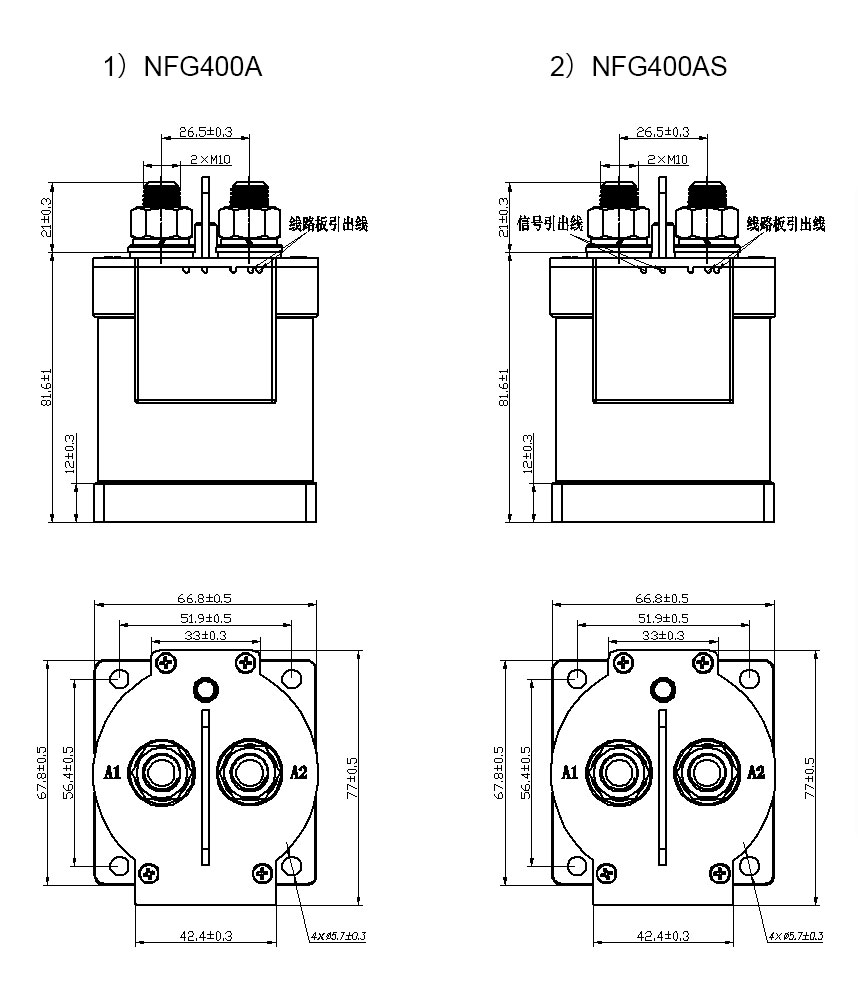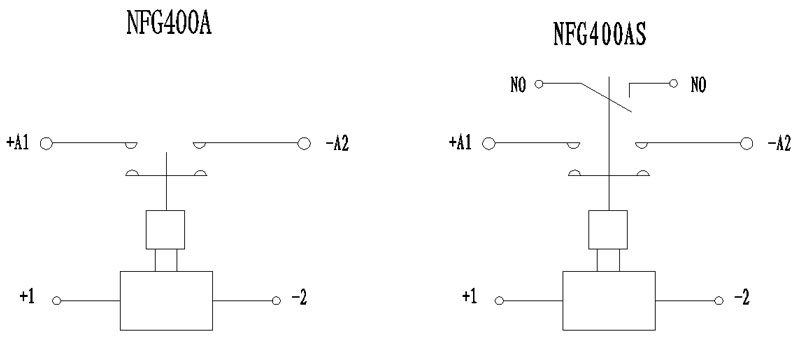 Exemple : NFG400AS indique que le courant nominal de la charge du produit est de 400 A (résistif), la forme du contact principal est un contact normalement ouvert (filetage extérieur) avec un contact auxiliaire normalement ouvert, la tension de la bobine est de (9-36) V (CC) et la méthode d'installation est par le bas.