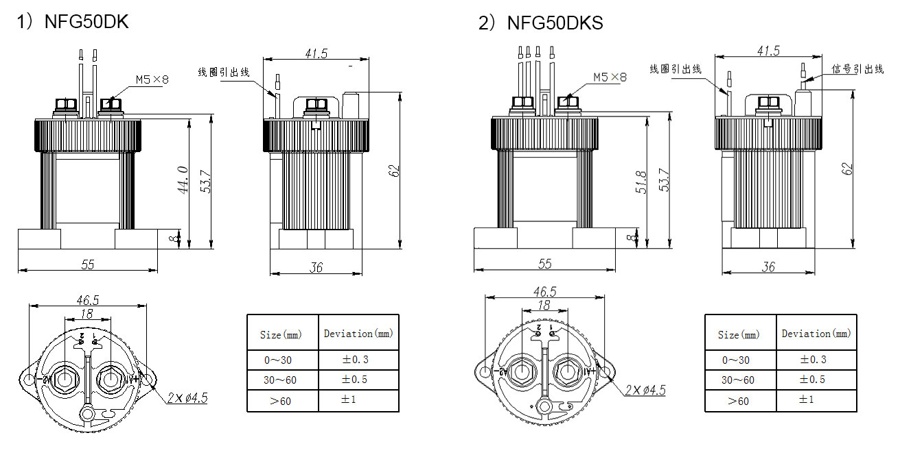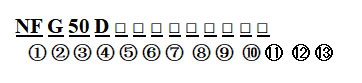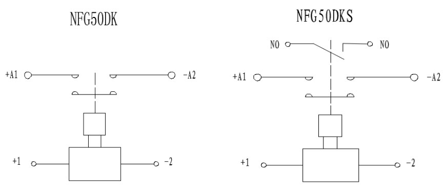Exemple : NFG50DK/24 indique que le courant nominal de la charge du produit est de 50 A (résistif), la forme du contact principal est un contact normalement ouvert (filetage interne), la tension de la bobine est de 24 V CC et la méthode de montage par le bas est utilisée.