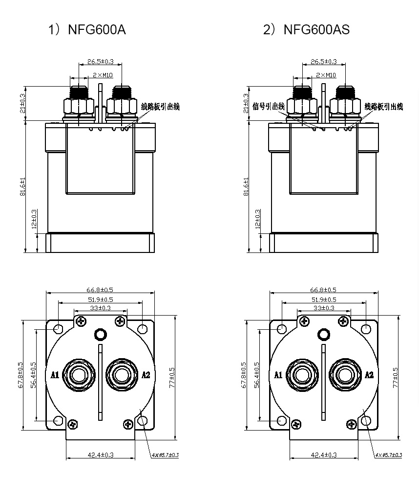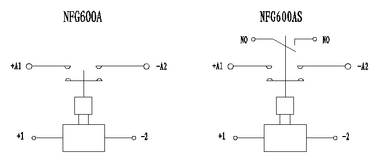 Exemple : NFG600AS indique que le courant nominal de la charge du produit est de 600 A (résistif), la forme du contact principal est un contact normalement ouvert (filetage extérieur) avec un contact auxiliaire normalement ouvert, la tension de la bobine est de (9-36) V (CC) et la méthode d'installation est par le bas.